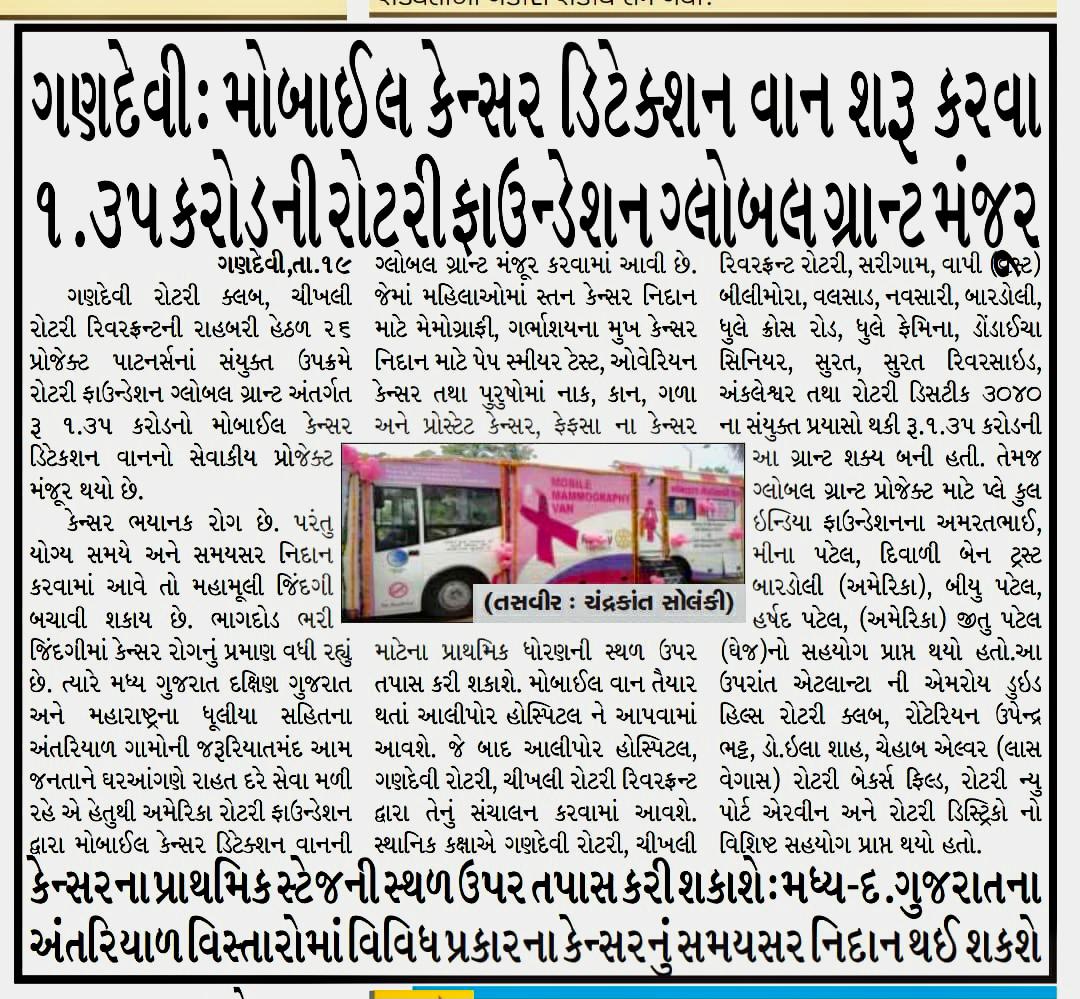 Our Global. Grant of Rs. 1 Cror 35. Lacs will bring Our recipient club in India this Great Cancer Detection Van to benefit Pooran in 200 square miles of remote tribal area. Congratulations team EDH