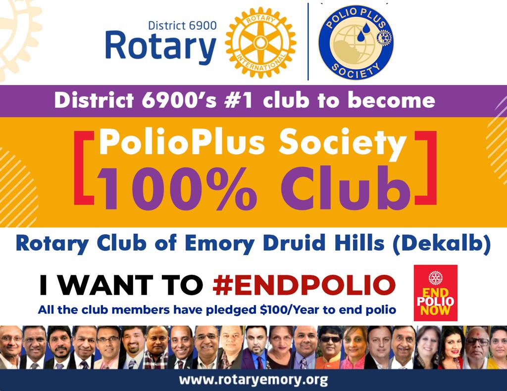 All the members of Rotary Club of Emory Druid Hills, Dist 6900 pledged their financial support and became the first in the district to be a [Polio Plus Society 100% Club]
